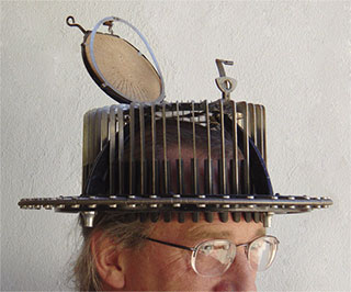When you “put it on” the way you would wear your hat, it lines up a series of pins that create a punched card with a top-down outline of your head - and the examples shown here are for real